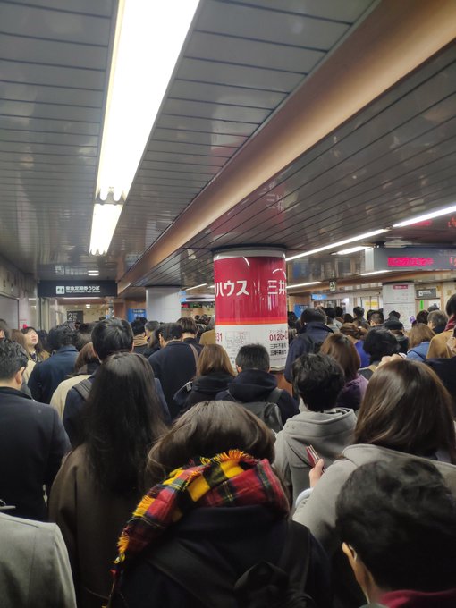 宇治通 No Twitter 出勤中の部員からの情報によると 雪の影響で 11時現在でも田園都市線三軒茶屋駅は入場規制がかかって写真のような状況 3時間並んで5メートルしか進んでないということです 警官もきて殺気立ってるとの情報 Https T Co Y8wq7ppnnz